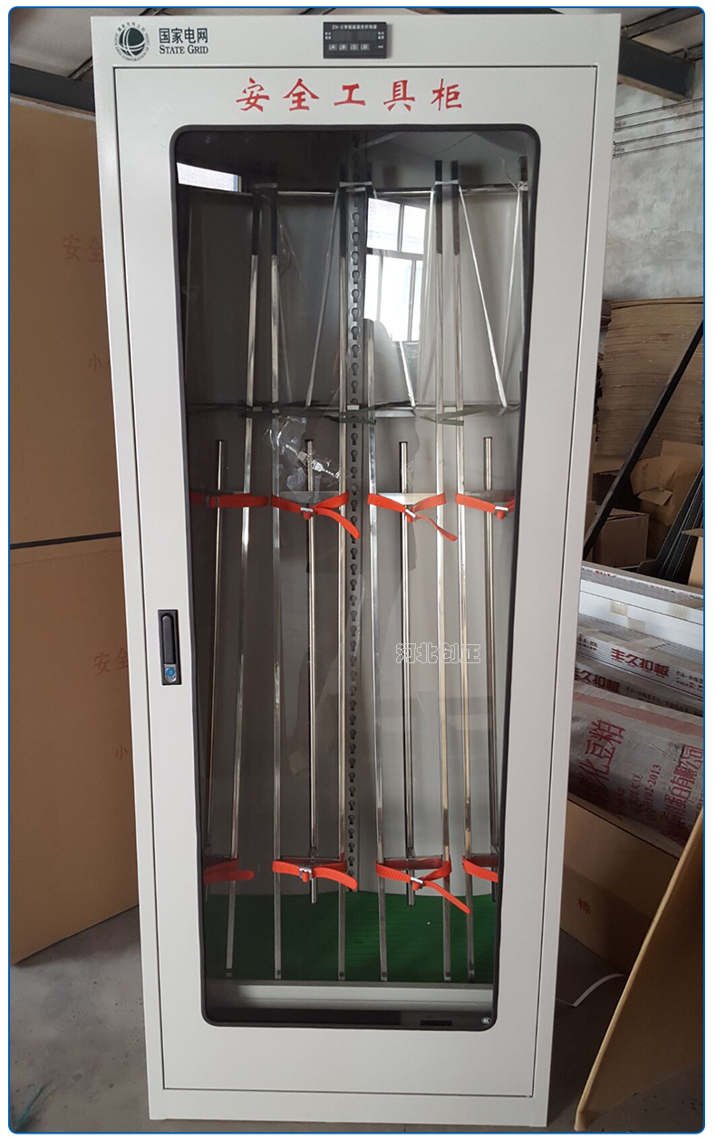 1、柜體是冷軋鋼板卷壓成型,厚度有1.0mm1.2mm,1.5mm供選擇。柜體表面采用靜電防腐噴塑工藝,顏色為駝灰色,柜門裝有通體透明鋼化玻璃,透過玻璃可以看到分類有序的工器具。