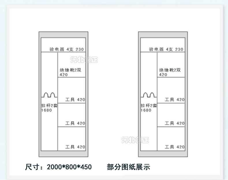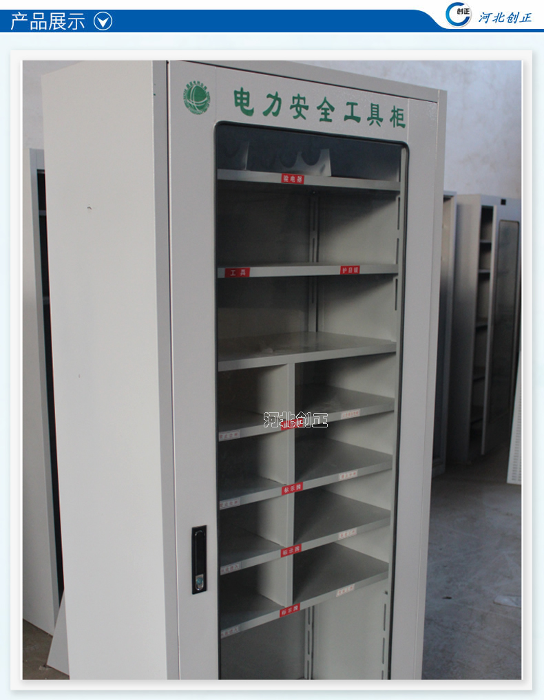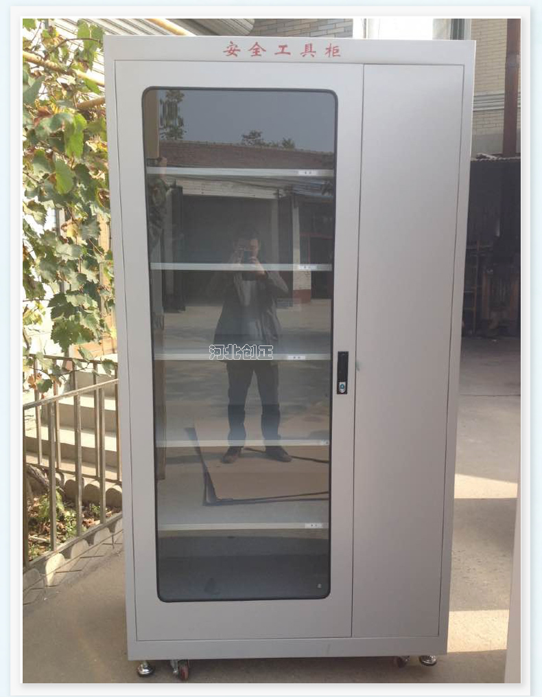 1、柜體是冷軋鋼板卷壓成型,厚度有1.0mm1.2mm,1.5mm供選擇。柜體表面采用靜電防腐噴塑工藝,顏色為駝灰色,柜門(mén)裝有通體透明鋼化玻璃,透過(guò)玻璃可以看到分類(lèi)有序的工器具。